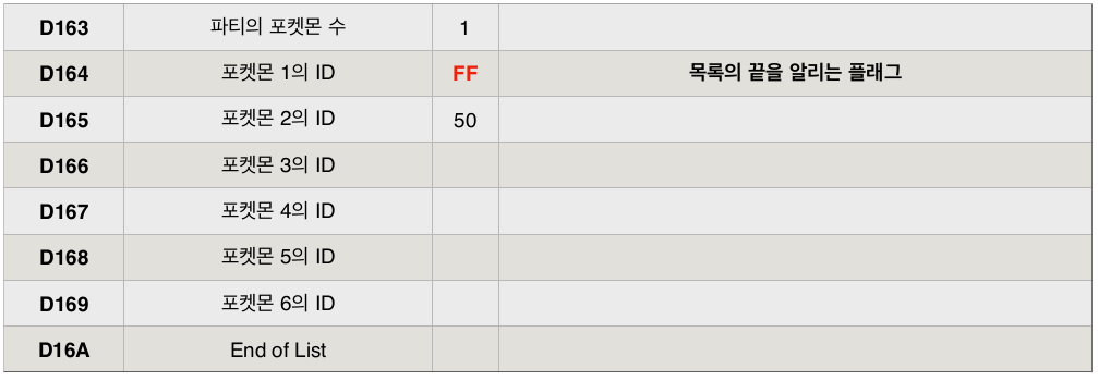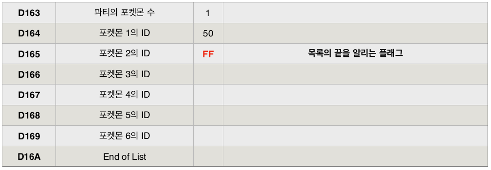 포켓몬 게임에서는 최초 포켓몬을 받은 이후 평상시에 포켓몬은 무조건 1마리 이상은 지니고 있게 됩니다. 그래서 게임이 지닌 포켓몬의 수를 파악하려는 경우, D164가 아닌 D165부터 FF(끝을 알리는 플래그)를 찾으려고 합니다.