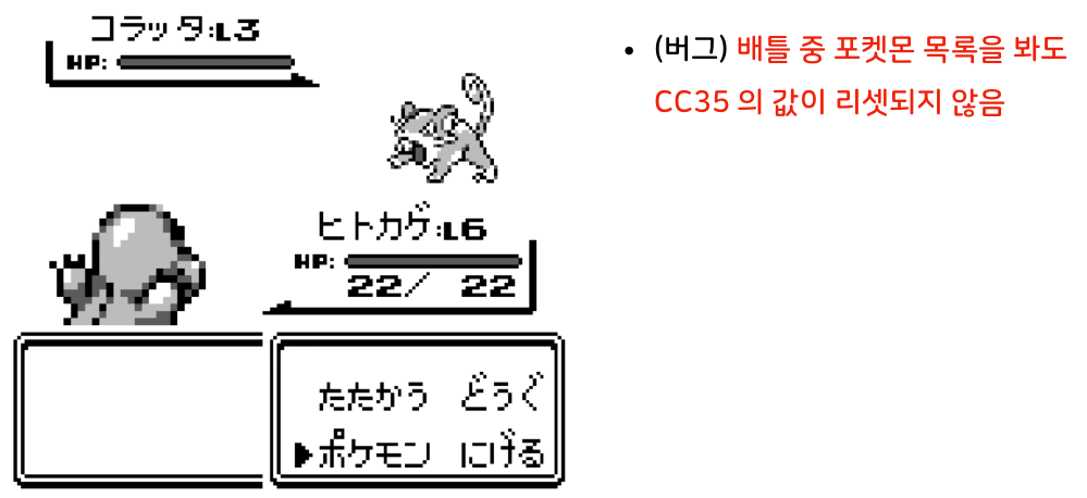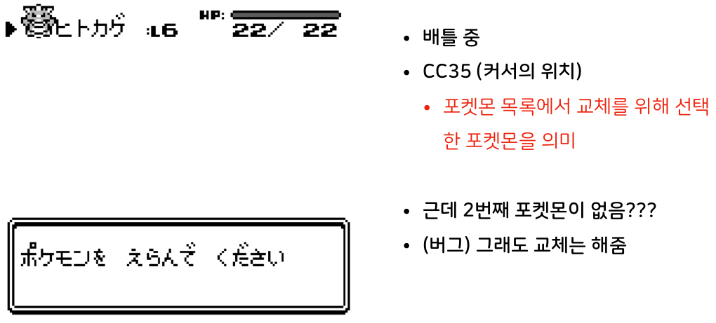 그런데 또 버그로 인해 야생 포켓몬과의 전투 화면에서 포켓몬 목록으로 들어가도 CC35의 값이 초기화되지 않고 유지됩니다. 그래서 이 상태에서 게임은 사용자가 교체를 위해 2번째 포켓몬을 선택했다고 생각하게 됩니다. 이제 A 버튼을 누르면 실제로는 2번째 포켓몬이 없지만 버그로 인해 포켓몬이 교체가 됩니다.