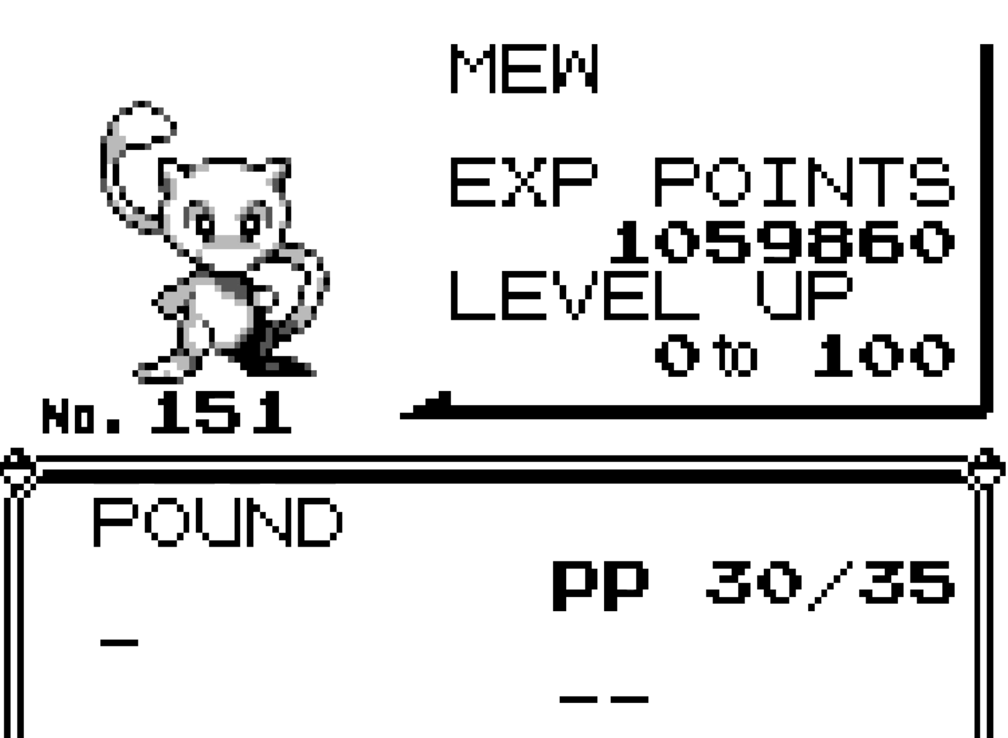 그래서 Medium Slow 그룹인 레벨 1의 포켓몬의 경우 초기 경험치가 로 해석되고, 만약 보다 적은 양의 경험치를 받게 되면 한 번에 레벨 100이 되는 버그가 발생하게 됩니다.