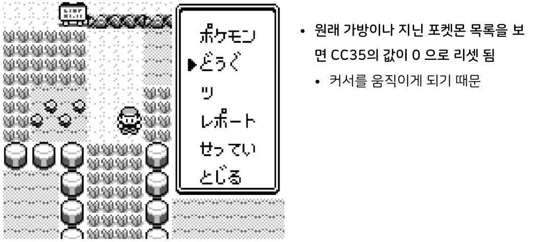 한편, 메모리의 효율적인 활용을 위해 CC35는 2가지 용도로 사용됩니다. 앞서 살펴본 아이템 목록에서 몇 번째 아이템을 선택했는지 저장하기도 하지만, 포켓몬 목록에서 순서를 바꾸기 위해 몇 번째 포켓몬을 선택했는지 저장하기도 합니다.
