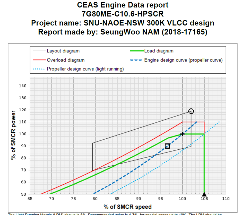 네 번째, 확정된 프로펠러의 치수와 주기관의 사양을 통해 어떤 주기관을 사용할지 실제 엔진 모델을 확정하게 됩니다. 이 과정에서 주기관의 회전수-마력 그래프를 활용합니다. 아래의 그림7은 주기관의 회전수-마력 그래프로, MAN 엔진회사의 프로그램을 활용하여 예시로 그려보았습니다. 복잡하게 생겼지만, 회색 실선으로 그려진 사각형, +와 ㅁ표시의 점만 기억하면 됩니다. 회색 실선으로 그려진 사각형은 실제 엔진의 사양 범위을 나타낸 그래프로, 여기서는 MAN사의 ‘7G80ME-C10.6-HPSCR’ 엔진이 낼 수 있는 회전수와 마력을 범위로 나타낸 것입니다. 즉, 이 엔진을 사용할 경우 회색 사각형 안에서만 엔진의 운용이 가능하다는 뜻입니다. ㅁ표시의 점은 평상시 배의 엔진 회전수와 마력을 표시한 점입니다. +표시의 점은 긴급 상황 시 배가 낼 수 있는 최대 엔진 회전수와 마력을 표시한 점입니다. 즉, 저 두 점이 모두 회색 사각형 안에 들어왔기 때문에, ‘7G80ME-C10.6-HPSCR’ 엔진을 사용하는 것이 적절하다고 판단할 수 있습니다.