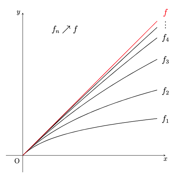 정리. (단조 수렴 정리) \(f_n: X \rightarrow[0, \infty]\) 가 measurable이고 모든 \(x \in X\) 에 대하여 \(f_n(x) \leq f_{n+1}(x)\) 라 하자. \[\lim_{n\rightarrow\infty} f_n(x) = \sup_{n} f_n(x) = f(x)\] 로 두면, \[\int f \,d{\mu} = \lim_{n\rightarrow\infty} \int f_n \,d{\mu} = \sup_{n \in \mathbb{N}} \int f_n \,d{\mu}\] 이다.